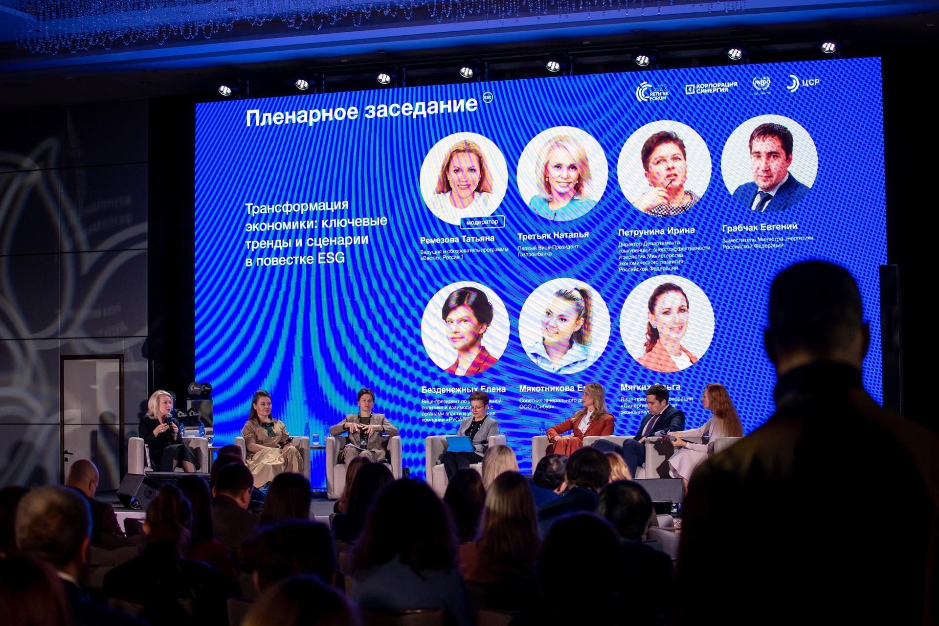 Пленарное заседание было посвящено трансформации экономики, ключевым трендам и сценариям в повестке ESG в условиях санкций. Модератором заседания выступила Татьяна Ремезова, ведущая и обозреватель программы «Вести» телеканала Россия 1. В дискуссии приняли участие Наталья Третьяк, первый вице-президент Газпромбанка, Ольга Ускова, российский предприниматель, основатель и Президент ГК Cognitive Technologies, генеральный директор Cognitive Pilot, Ирина Петрунина, директор Департамента конкуренции, энергоэффективности и экологии Минэкономразвития РФ, Евгений Грабчак, заместитель Министра энергетики РФ, Елена Безденежных, вице-президент по региональной политике и взаимодействию с органами власти и управления компании «РУСАЛ», Елена Мякотникова, советник генерального директора «Сибур».