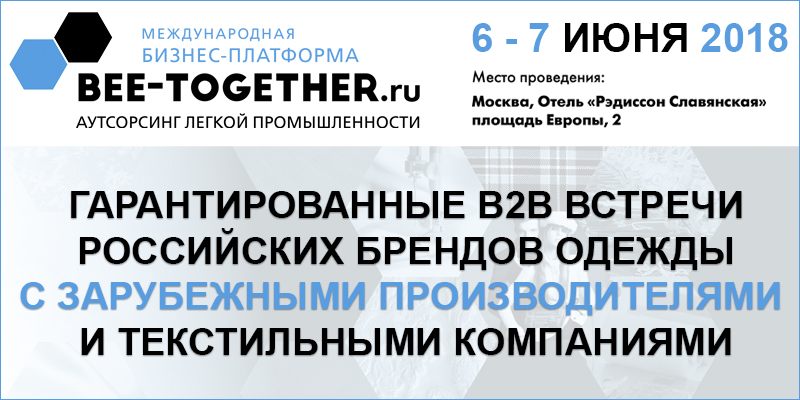 *BEE-TOGETHER.ru – это проект, созданный Русской ассоциацией участников фешен-индустрии (РАФИ) в 2016 году. Уникальная бизнес-мэчинг платформа гарантирует b2b встречи российских брендов одежды с зарубежными производителями и текстильными компаниями.