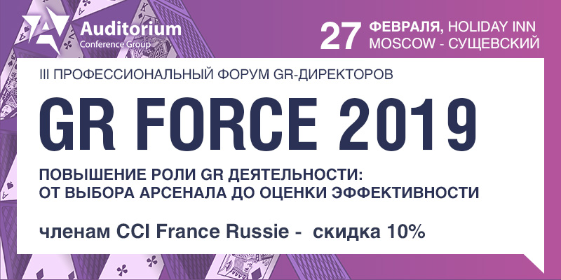 27 февраля 2019 в Москве на III Профессиональном форуме GR-директоров: «GR FORCE 2019. Повышение роли GR деятельности: от выбора арсенала до оценки эффективности» лицом к лицу встретятся представители разных отраслей бизнеса и власти.