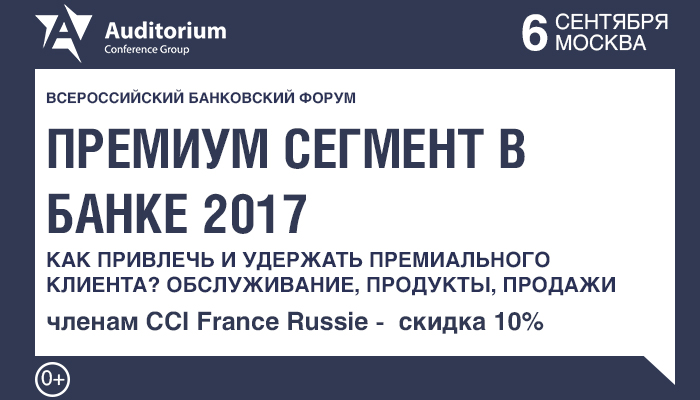 Компания «Auditorium» приглашает Вас принять участие в III Всероссийском банковском форуме «PREMIUM BANKING FORUM 2017. Как привлечь и удержать премиального клиента? Обслуживание, продукты, продажи» 6 сентября, Москва.
