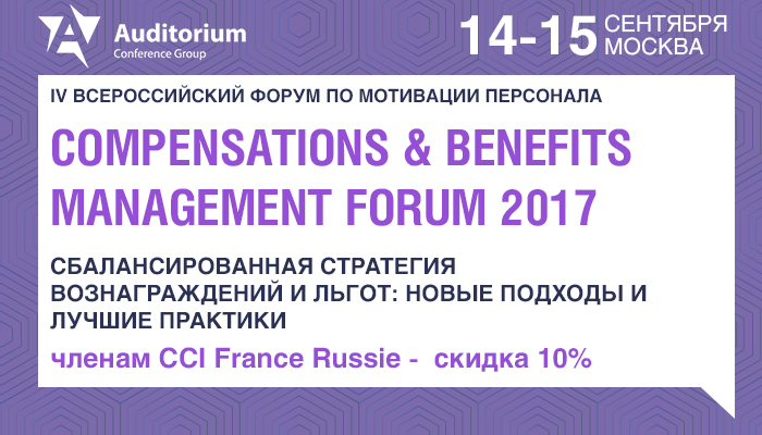 Компания «Auditorium» приглашает Вас принять участие в IV Всероссийском Форуме по Мотивации Персонала «COMPENSATIONS & BENEFITS MANAGEMENT FORUM 2017. Сбалансированная стратегия вознаграждений и льгот: новые подходы и лучшие практики» 14-15 сентября в Москве.