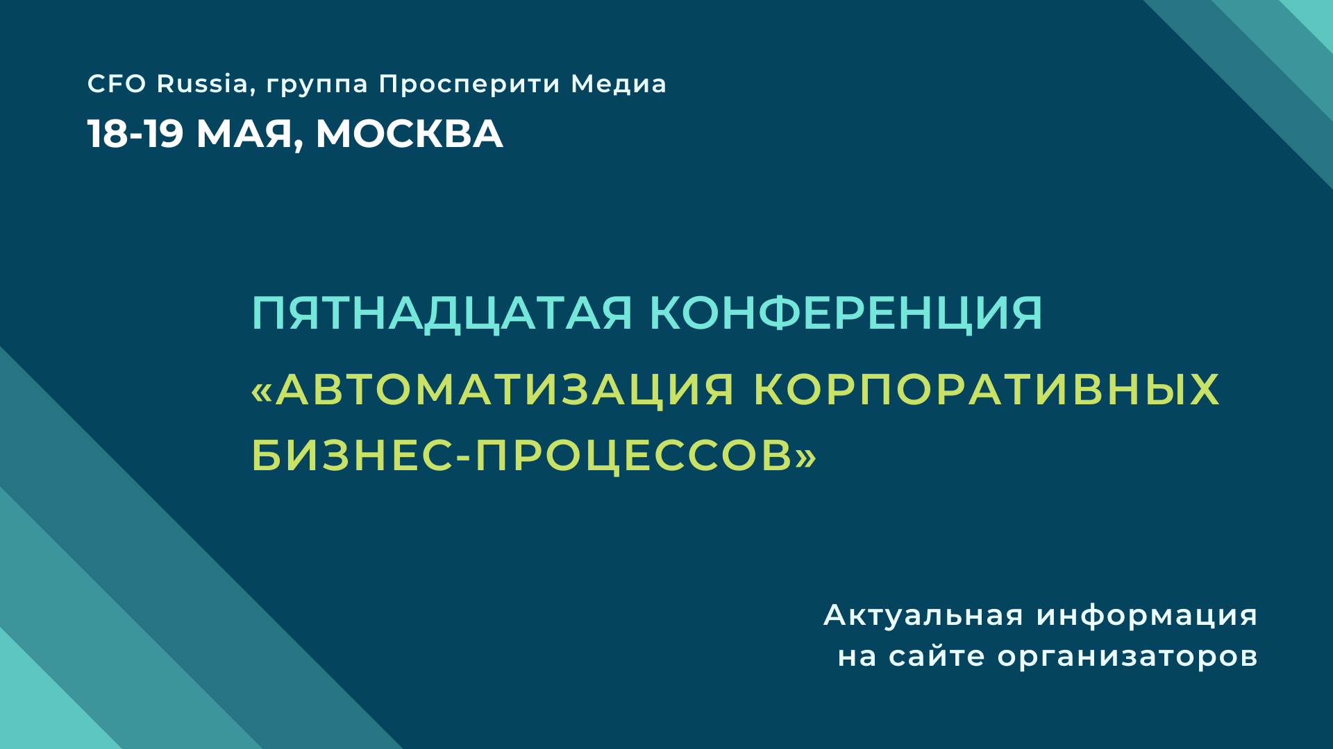 18-19 мая в Москве пройдет Пятнадцатая конференция «Автоматизация корпоративных бизнес-процессов» организованная группой «Просперити Медиа» и порталом CFO-Russia.ru.