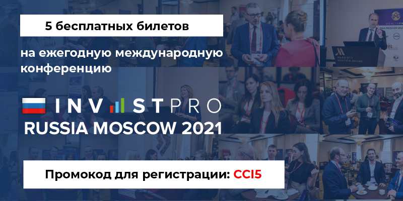 Введите промокод CCI5 во время регистрации, чтобы получить один из 5 БЕСПЛАТНЫХ билетов на конференцию InvestPro Russia Moscow 2021!