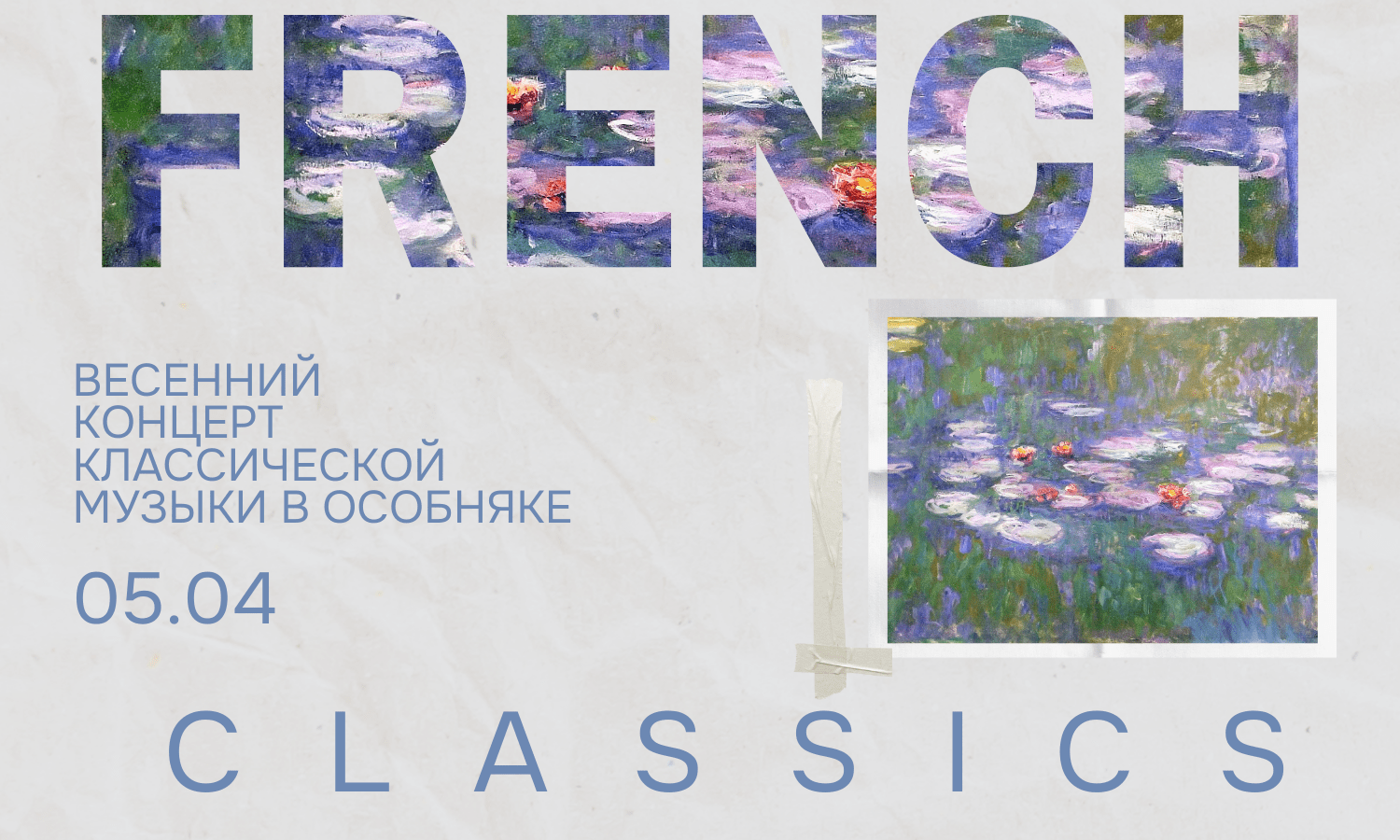 «French Classics» пройдет в интерьерах элегантного особняка, где все дышит роскошью и великолепием минувшей эпохи. Вы получите редкую возможность провести незабываемый вечер внутри этой уникальной исторической усадьбы и насладиться великой музыкой. Мелодии французских композиторов – Бизе, Делиба, Сати, Оффенбаха, Дебюсси и исполнит струнный квартет GLORIA.