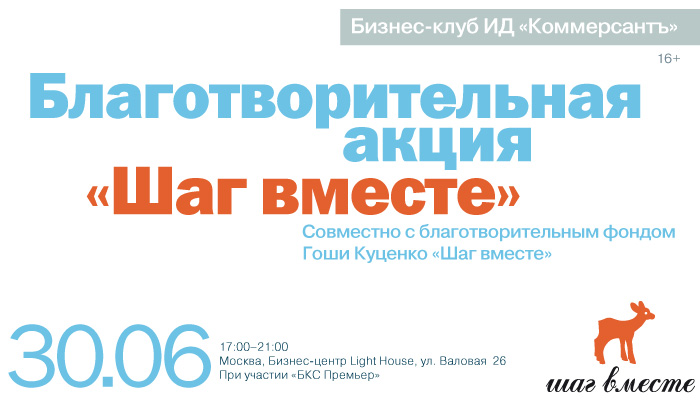 30 июня ИД «Коммерсантъ» совместно с благотворительным фондом Гоши Куценко и компанией «БКС Премьер» проведет в Москве благотворительную акцию «Шаг вместе».