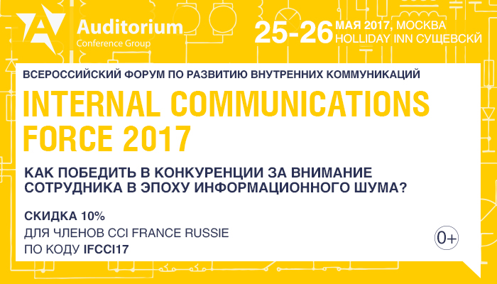 Компания Auditorium приглашает Вас принять участие во всероссийском Форуме по развитию внутренних коммуникаций «INTERNAL COMMUNICATIONS FORCE 2017. Как победить в конкуренции за внимание сотрудника в эпоху информационного шума?», который состоится 25-26 мая в Москве.