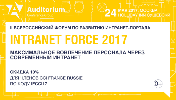 Компания Auditorium приглашает Вас принять участие во II Всероссийском Форуме по развитию интранет-портала «INTRANET FORCE 2017. Максимальное вовлечение персонала через современный интранет», который состоится 24 мая в Москве.
