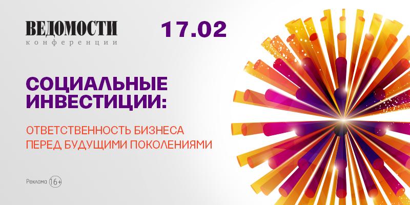 17 февраля газета «Ведомости» проведет конференцию «Социальные инвестиции: ответственность бизнеса перед будущими поколениями». В рамках деловой программы выступят представители отраслевых ведомств, крупного бизнеса и фондов, ведущие эксперты и аналитики отрасли.