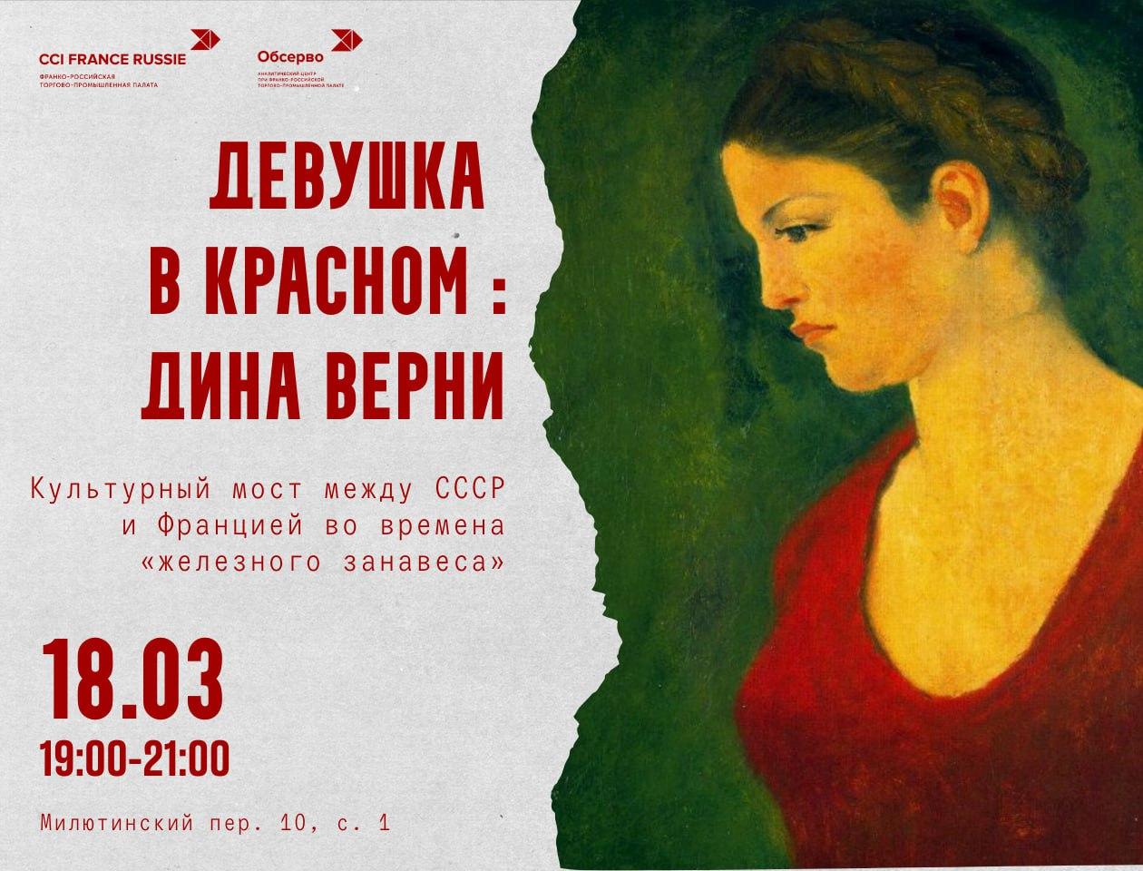 Франко-российская торгово-промышленная палата и Аналитический центр Обсерво приглашают на мартовский литературно-исторический вечер, традиционно посвященный легендарным женщинам в истории франко-российских связей. В этом году нашей героиней станет Дина Верни.