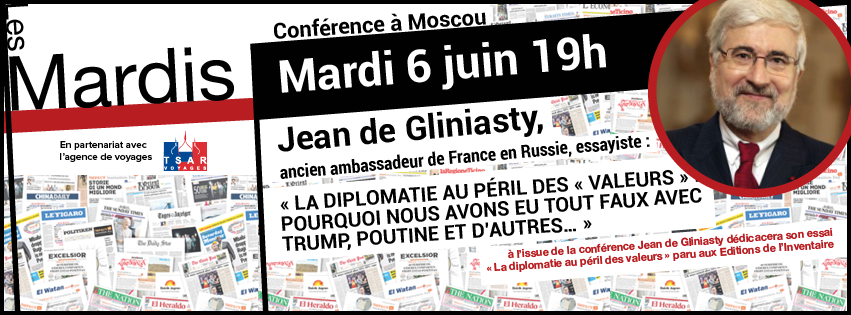 Mardi 6 juin, Jean de Gliniasty, ancien ambassadeur de France en Russie, essayiste donnera une conférence sur le thème : « La diplomatie au péril des « valeurs » : pourquoi nous avons eu tout faux avec Trump, Poutine et d’autres… ».