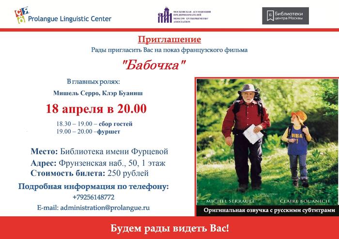 Французский лингвистический центр PROLANGUE рад пригласить Вас на показ французского фильма «Бабочка» 18 апреля в Библиотеке им. Фурцевой!