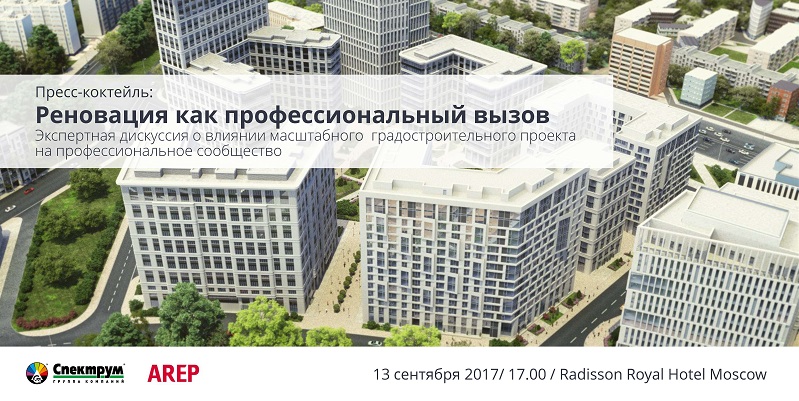 Консорциум проектного бюро AREP и группы компаний Спектрум, участник архитектурно-градостроительного конкурса на разработку концепций экспериментальных площадок реновации жилищного фонда в Москве, проводит в рамках международного инвестиционного форума по недвижимости PROESTATE-2017, пресс-коктейль «Реновация как профессиональный вызов».