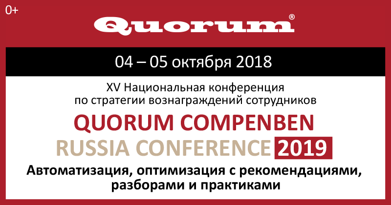 04 – 05 октября 2018 в Москве состоится масштабное событие в сфере С&B – XV юбилейная Национальная Конференция QUORUM COMPENBEN RUSSIA CONFERENCE 2019: Автоматизация, оптимизация с рекомендациями, разборами и практиками.