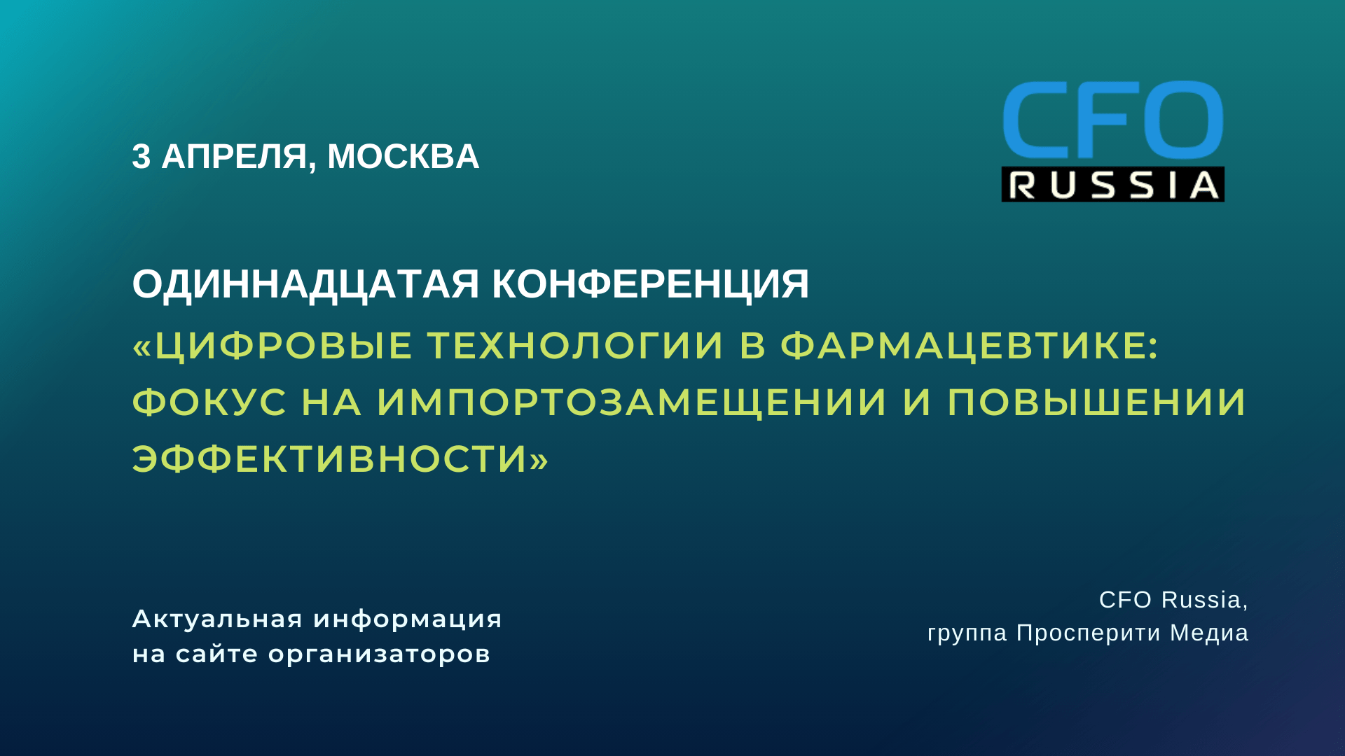 3 апреля, в Москве, состоится Одиннадцатая конференция «Цифровые технологии в фармацевтике: фокус на импортозамещении и повышении эффективности», организованная группой «Просперити Медиа» и порталом CFO-Russia.ru