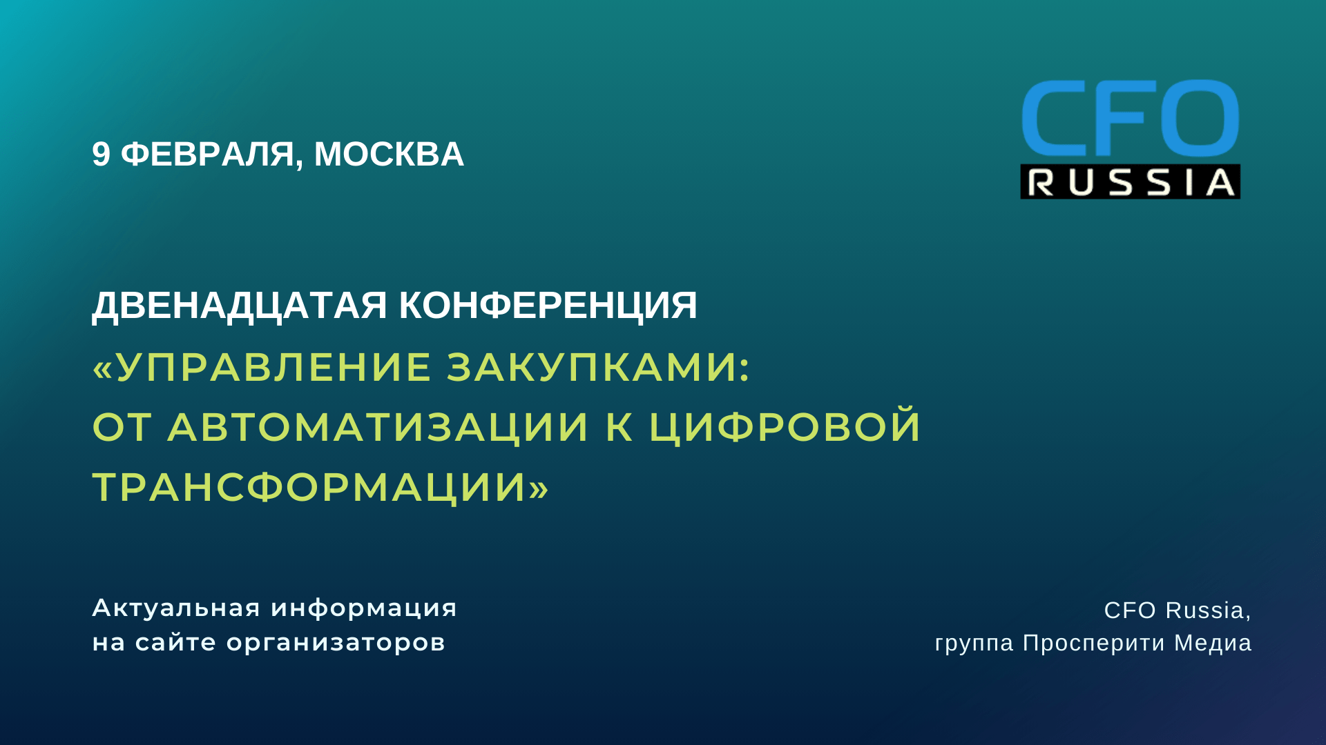 9 февраля в Москве пройдет Двенадцатая конференция «Управление закупками: от автоматизации к цифровой трансформации», организованная группой «Просперити Медиа» и порталом CFO-Russia.ru.