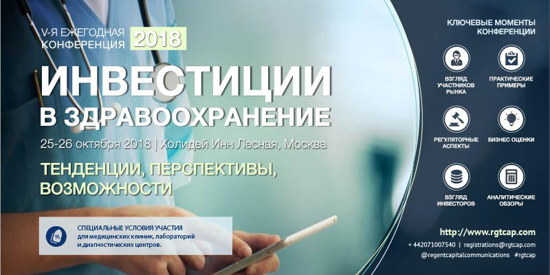 Компания Regent Capital Communications приглашает Вас принять участие в V-й конференции «Инвестиции в Здравоохранение», которая состоится 25-26 октября 2018 в Москве. В рамках двухдневного мероприятия ключевые игроки рынка обсудят инвестиционные возможности, новые точки роста а также существующие бизнес-модели и стратегические решения – все то, что крайне необходимо для успешного развития в динамично меняющихся условиях рынка.
