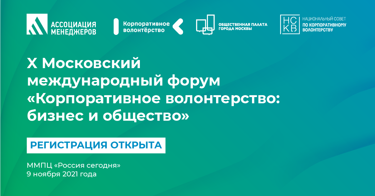 9 ноября 2021 года пройдет Х Московский международный форум «Корпоративное волонтерство: бизнес и общество», организованный Ассоциацией Менеджеров, Национальным советом по корпоративному волонтёрству (НСКВ) и Общественной палатой города Москвы.