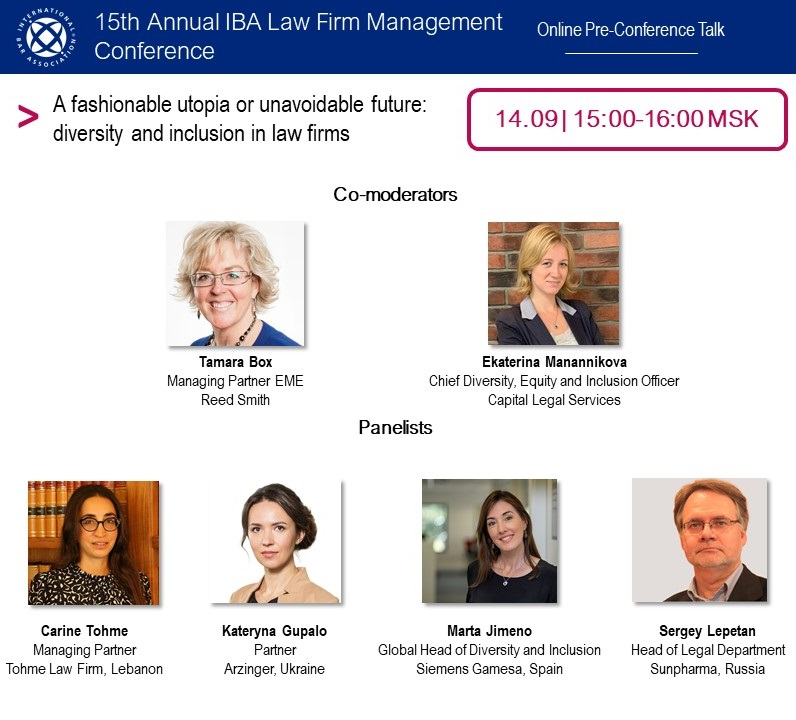 В преддверии подготовки к XV Конференции IBA по управлению юридической фирмой в Москве 14 сентября в 15:00 по МСК состоится вебинар-панельная дискуссия на тему «Модный тренд или неизбежное будущее: разнообразие и инклюзивность в юридических фирмах». Мероприятие пройдет на английском языке (оригинальное название: «A fashionable utopia or unavoidable future: diversity and inclusion in law firms»).