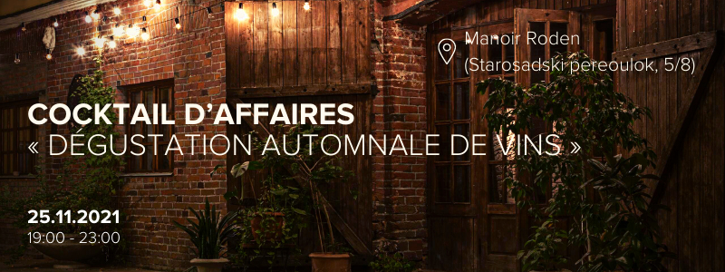 Le cocktail aura lieu à Roden Manor ("Ousadba Roden"), bâti à la fin du XVIIe siècle en plein coeur de Moscou. Les invités profiteront d'une soirée de networking accompagnée d'un buffet français dans l'ambiance conviviale d'un ancien manoir européen.