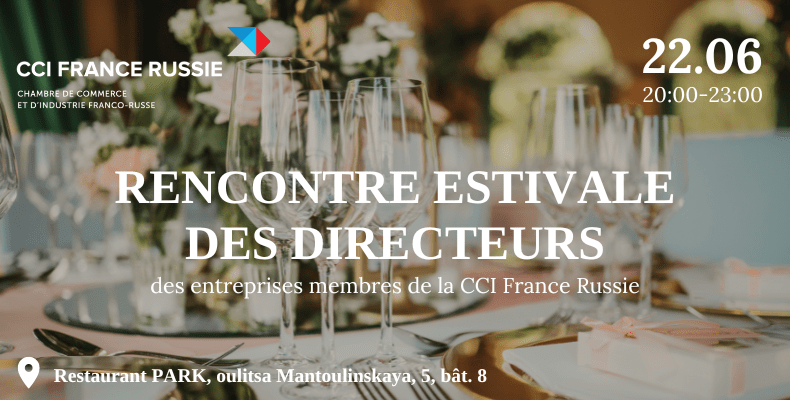 Le 22 juin, nous invitons les directeurs des entreprises membres à clôturer cette saison par le Dîner d'été de la Chambre de Commerce et d'Industrie franco-russe, qui se tiendra au sein du nouveau restaurant-orangerie « Park ».