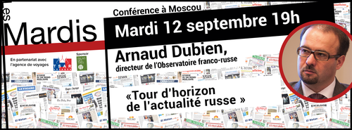 Mardi 12 septembre, à 19h, Arnaud Dubien, directeur de l’Observatoire franco-russe, donnera dans le cadre des Mardis une conférence sur le thème : «Tour d’horizon de l’actualité russe. »