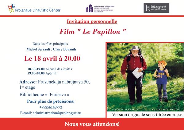Le centre linguistique Prolangue en collaboration avec l’association МАП a le plaisir de vous convier à la projection privée du film français « Le Papillon » sous titré en français le mercredi 18 avril à la bibliotheque « Furtsova »