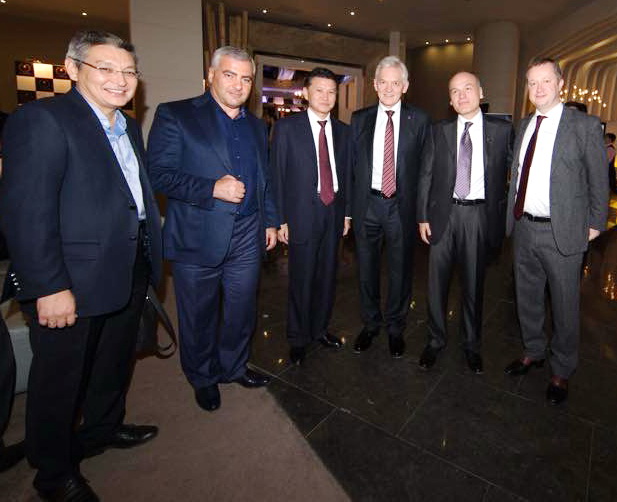 Sur la photo (de gauche à droite) : l’adjoint du président de la FIDE et directeur du Bureau de représentation de la FIDE en Russie Berik Balgabaev ; le Président du groupe Tashir Samvel Karapetyan ; le Président de la FIDE Kirsan Ilioumjinov ; le coactionnaire et membre du Conseil d’Administration de Novatek et coprésident du Conseil économique de la CCI France Russie Guennadi Timtchenko ; le président de la Fédération russe des échecs et membre du Conseil économique de la CCI France Russie Andreï Filatov ; le directeur général de la CCI France Russie, vice-président de la Fédération russe des échecs Pavel Chinsky |