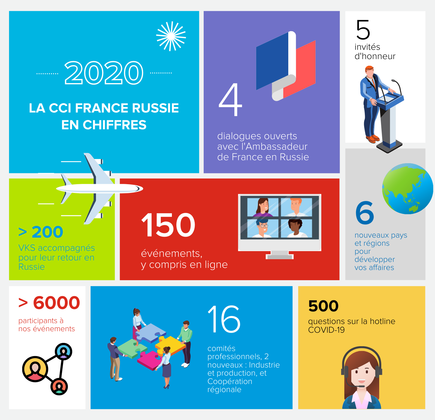 Les événements clés de l’année ont été les rencontres avec la présidente de la Banque centrale, Elvira Nabioullina, le chef du Service fédéral des impôts, Daniil Egorov, le représentant plénipotentiaire du président de la Fédération de Russie dans le district fédéral extrême-oriental, Youri Troutnev et les dirigeants des régions russes. Au cours de l’année, quatre dialogues en ligne ont été organisés pour nos membres avec l’ambassadeur de France en Russie, Pierre Levy, qui a répondu à vos questions.