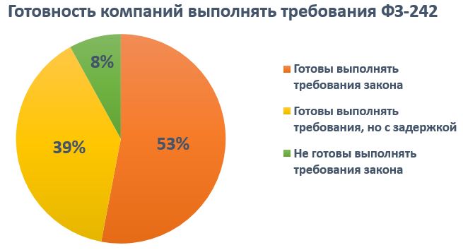 Генеральный директор Франко-российской торгово-промышленной палаты Павел Шинский рассказал о результатах опроса компаний-членов Палаты накануне вступления в силу закона. В анонимном опросе приняло участие более 50 крупнейших французских, российских и международных компаний из разных отраслей. На вопрос относительно готовности компаний к соблюдению требования 242-ФЗ о локализации баз данных с 1 сентября 2015 года более 53% опрошенных дали утвердительный ответ, около 39% заявили об общей готовности, но с возможной задержкой, и еще 8% компаний заявили, что не готовы выполнять требования закона.