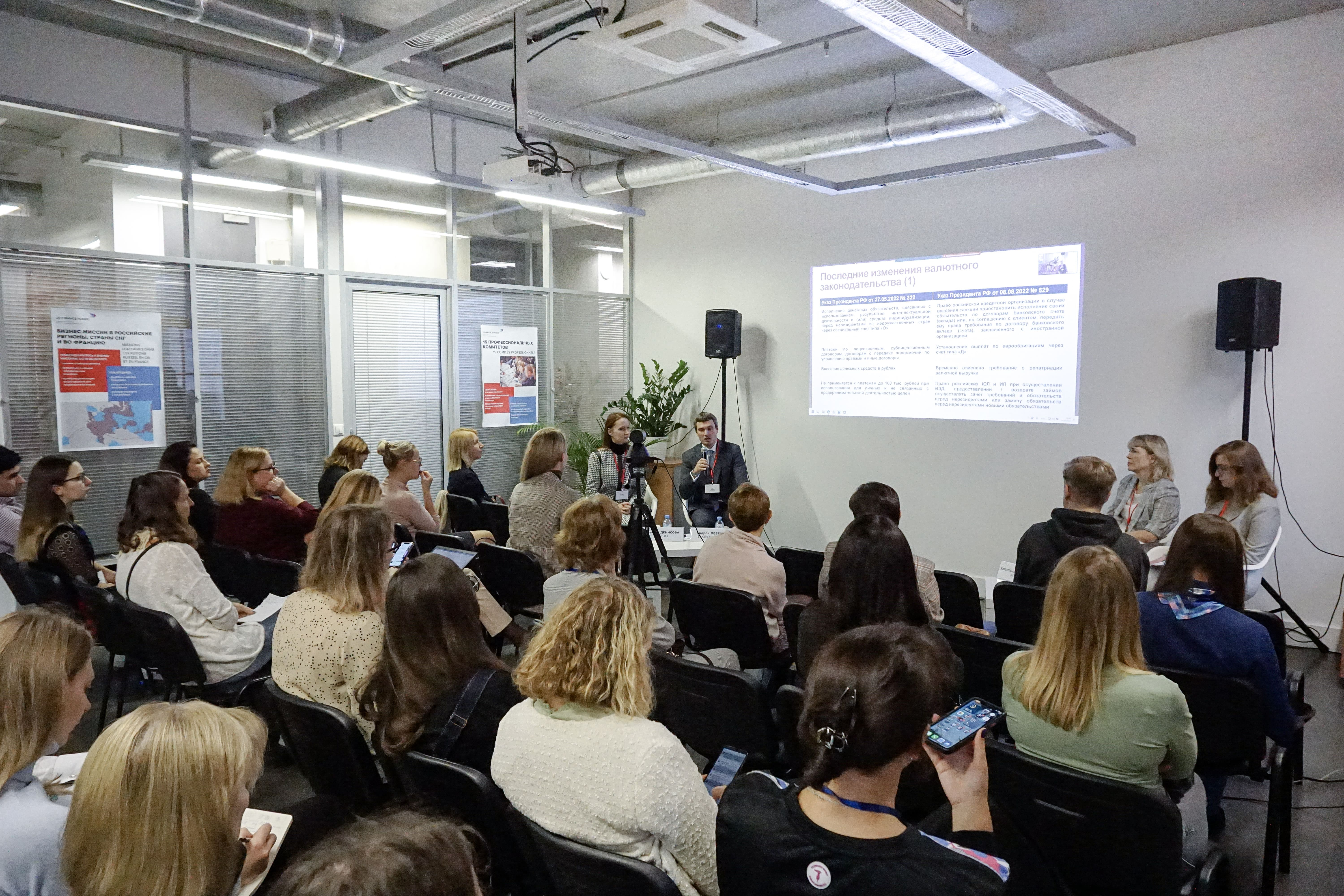 Спикерами мероприятия выступили Андрей Лебедев, старший юрист Baker McKenzie, Светлана Строганова, руководитель направления валютного контроля Росбанка, и Анастасия Гончарова, ведущий юрист Skif Consulting. Встречу открыла модератор Наталия Денисова, сопредседатель Комитета по финансам, безопасности и инвестициям CCI France Russie.