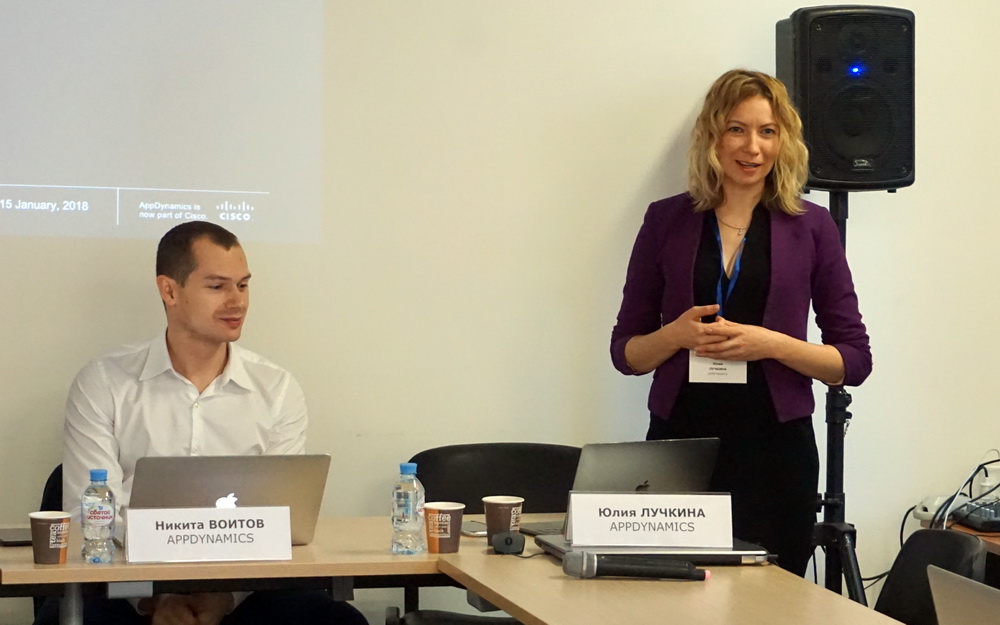 Юлия Лучкина, менеджер по работе с региональными клиентами AppDynamics, раскрыла участникам основные принципы работы платформы. С помощью платформы AppDynamics компании получают информацию о производительности их онлайн- и мобильных приложений, о влиянии процессов IT на пользователей и могут отслеживать транзакции и потери бизнеса.