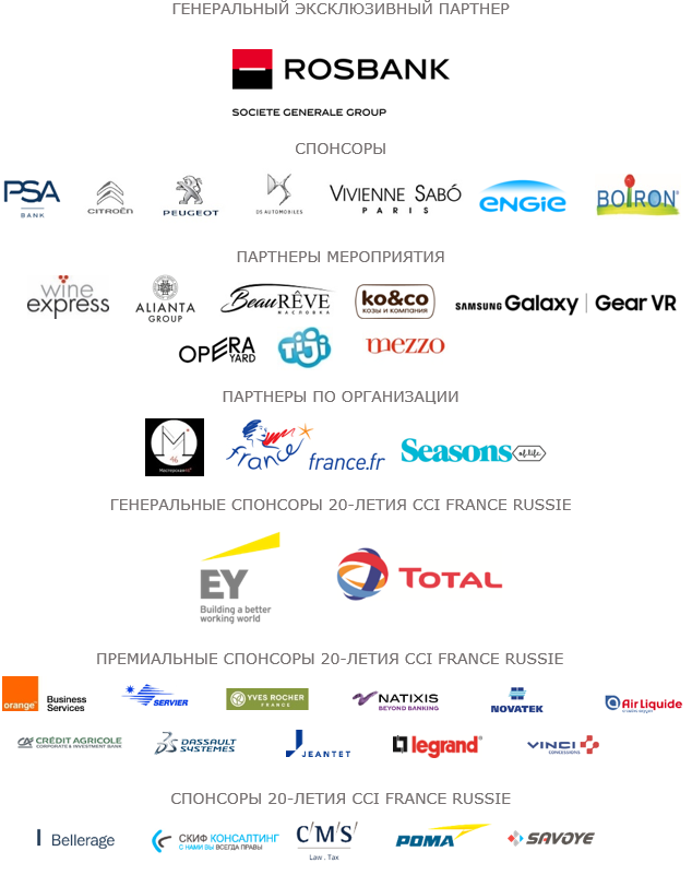 Франко-российская торгово-промышленная палата выражает благодарность спонсорам мероприятия: генеральному эксклюзивному партнеру – компании Росбанк, спонсорам – группе PSA, в которую входят бренды Citroën, Peugeot, DS Automobiles, компаниям Vivienne Sabo, Буарон, Engie, а также генеральным спонсорам 20-летия Франко-российской торгово-промышленной палаты – EY и Total.