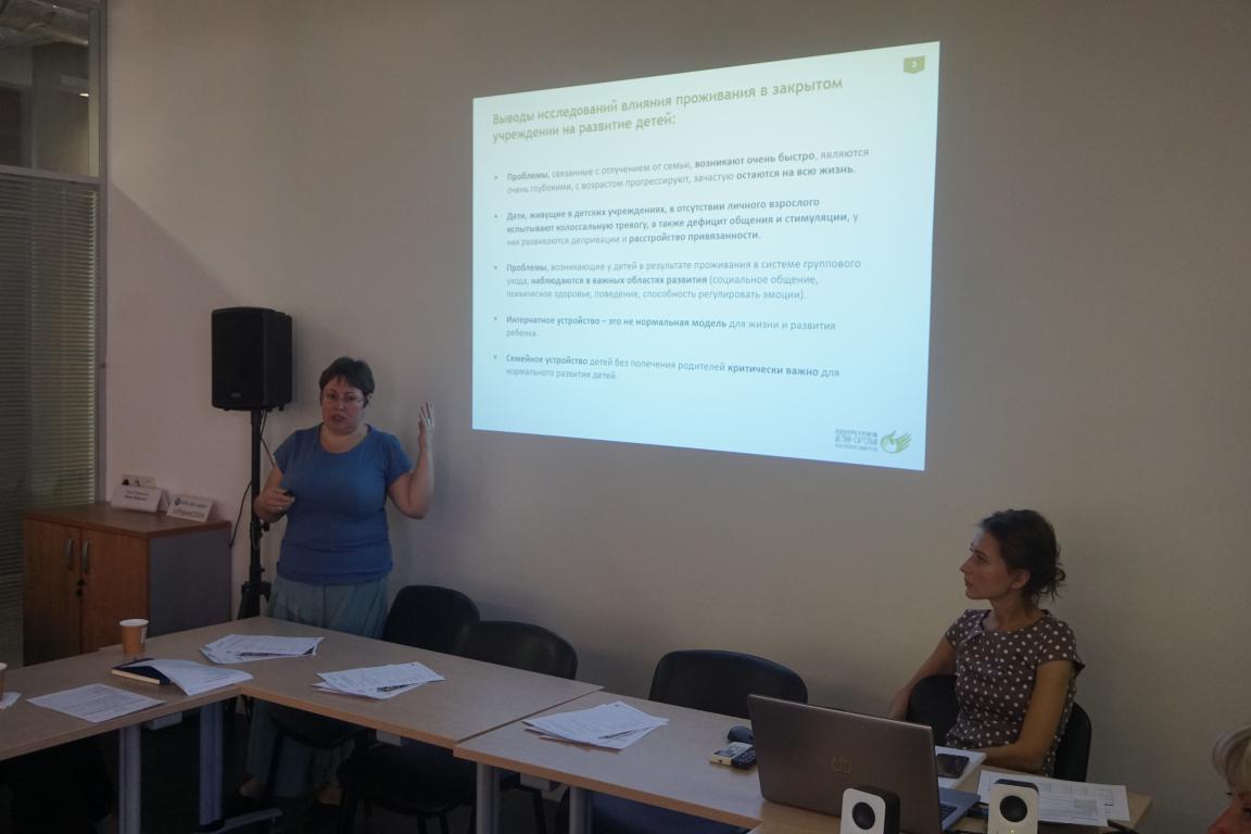 Сессия началась с выступления Елены Альшанской, Президента благотворительного фонда «Волонтеры в помощь детям-сиротам». Елена рассказала о формировании механизма привязанности у детей и о том, что если у ребенка нет «личного взрослого», он может не выжить. Интернатное устройство – это не нормальная модель для жизни и развития ребенка. «Дети в учреждениях – это обычные дети в необычной ситуации», отметила спикер. Проблемы, связанные с отлучением от семьи, возникают очень быстро, являются очень глубокими, с возрастом прогрессируют и зачастую остаются на всю жизнь.