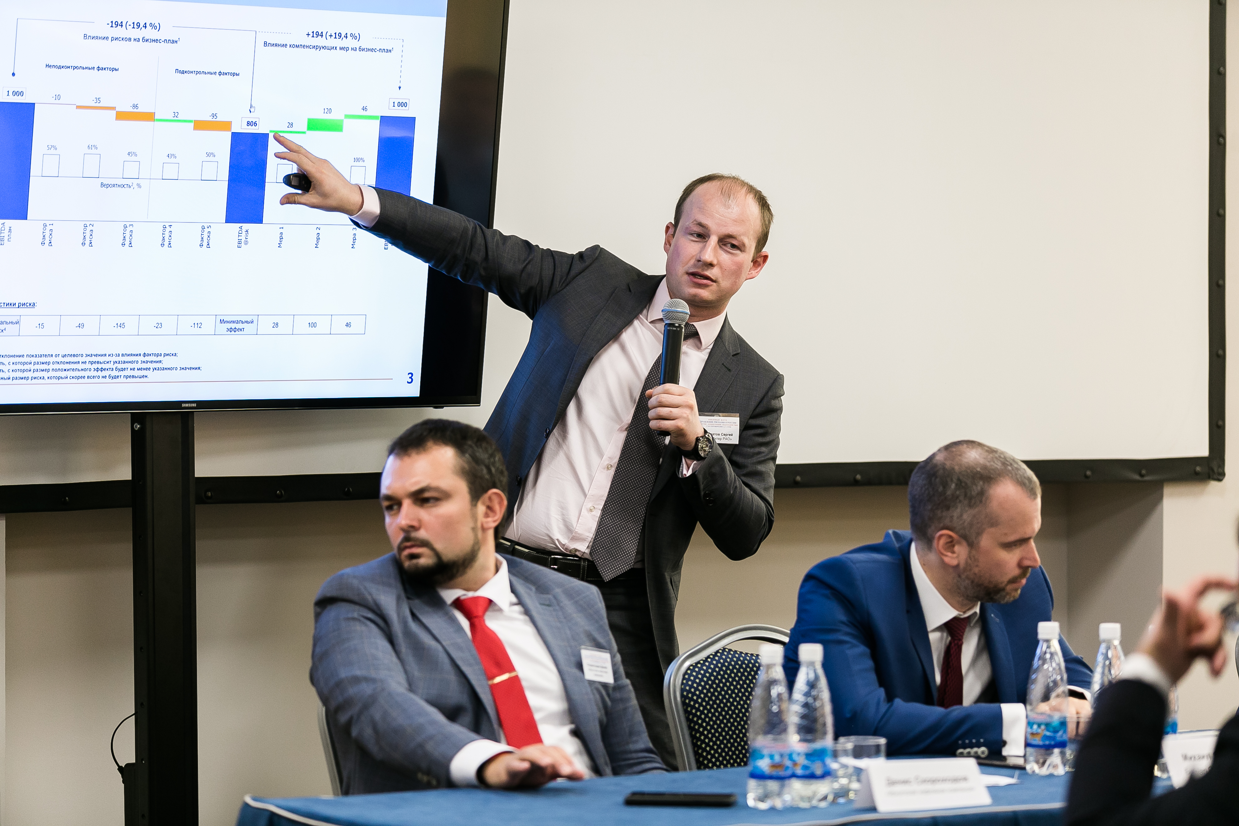 Панельная дискуссия Роль и место управления рисками и риск-менеджера в организации (модератор — Андрей Шишаков, профессор Московской школы управления «Сколково») открылась выступлением Реформа банковского регулирования до 2022 года: что ждет финансовый риск-менеджмент? Алексея Лобанова-директора Департамента банковского регулирования Банка России, которое традиционно вызвало большой интерес у аудитории. С докладом об актуальных задачах развития системы управления рисками в компаниях с госучастием выступила Елена Лоссь – президент РСМ Русь, председатель правления Международного центра передовых практик внутреннего контроля и управления рисками, руководитель комитета Росимущества по управлению рисками и внутреннему контролю. Практикой управления производственными и другими рисками поделились Вячеслав Новокшонов (СИБУР), Павел Смолков и Сергей Саламатов (ИнтерРАО), Михаил Федоров (Евразийская группа) и Денис Скороходов (Иркутская нефтяная компания).