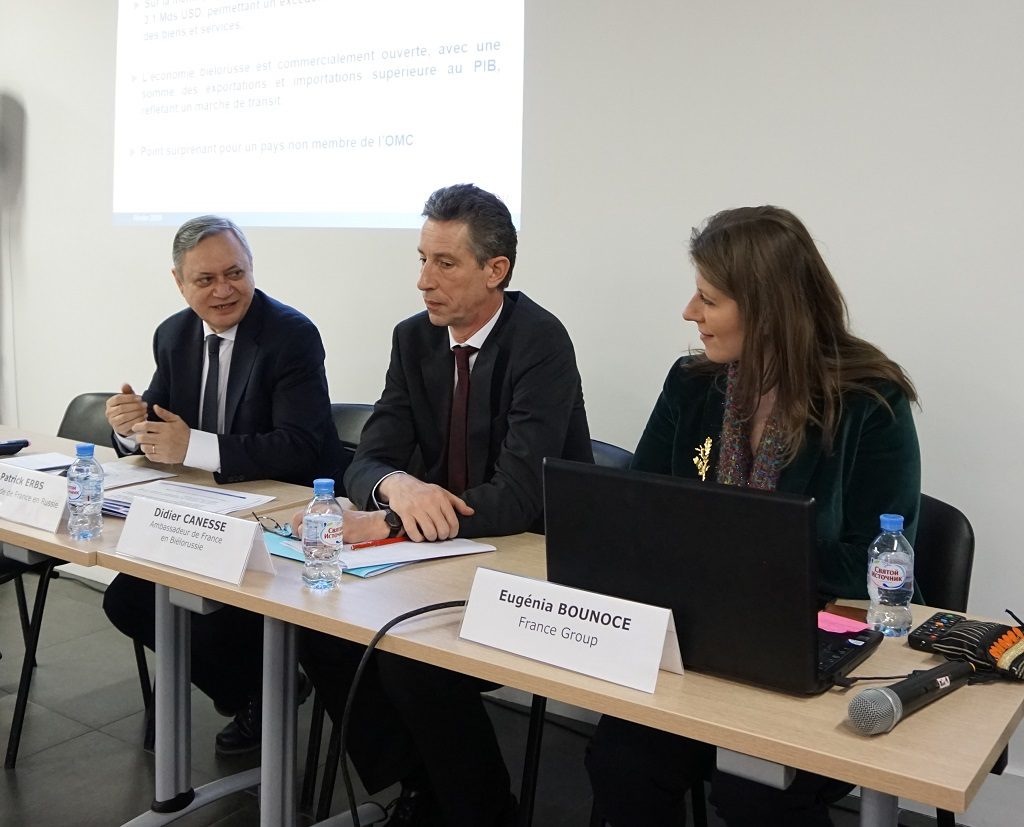 Вместе с главой Экономической службы Посольства Франции в РФ Патриком Эрбсом и директором ООО «Франс Групп» (Беларусь) Евгенией Бунос спикер рассказал об экономике Беларуси и перспективах работы французских компаний на ее территории.