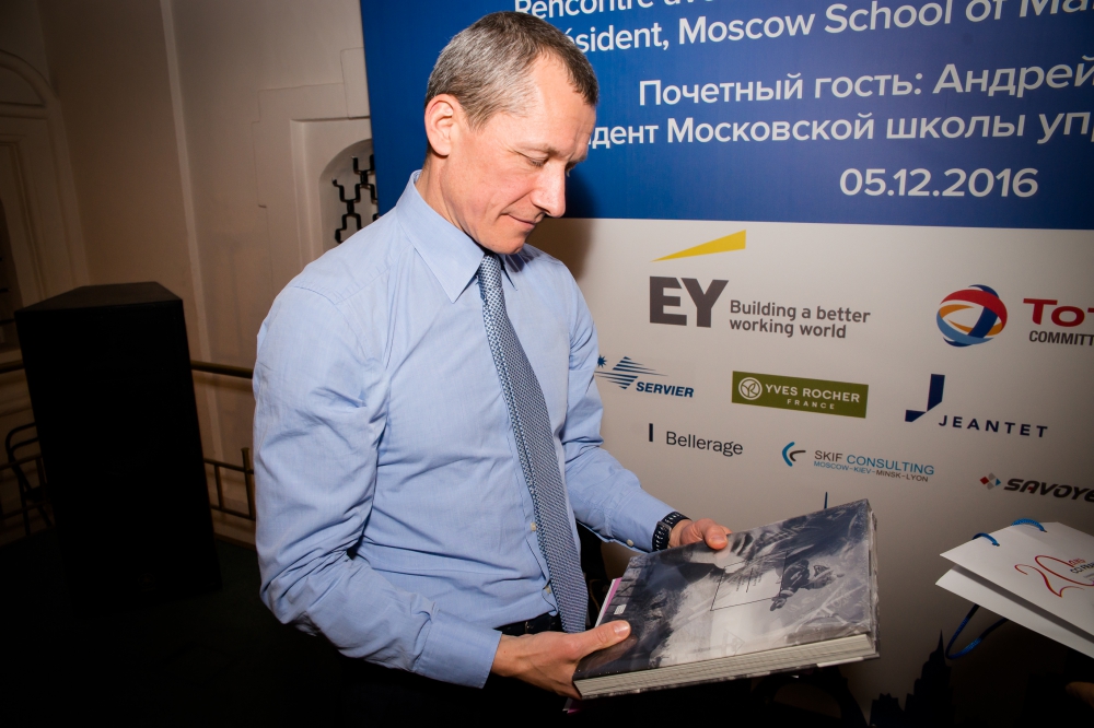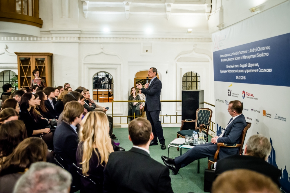 5 декабря в рамках мероприятий, посвящённых празднованию 20-летия Франко-российской торгово-промышленной палаты (CCI France Russie), состоялась встреча с почетным гостем — Андреем Шароновым, президентом Московской школы управления СКОЛКОВО, крупнейшей частной бизнес-школой в России и СНГ.С позиций человека, долгое время занимавшего ведущие государственные посты в экономическом блоке правительства, а затем ушедшего в частный бизнес, спикер представил свой взгляд на сферу бизнес-образования в России, взаимоотношения бизнеса и власти. Модератором встречи выступил генеральный директор Франко-российской торгово-промышленной палаты Павел Шинский.